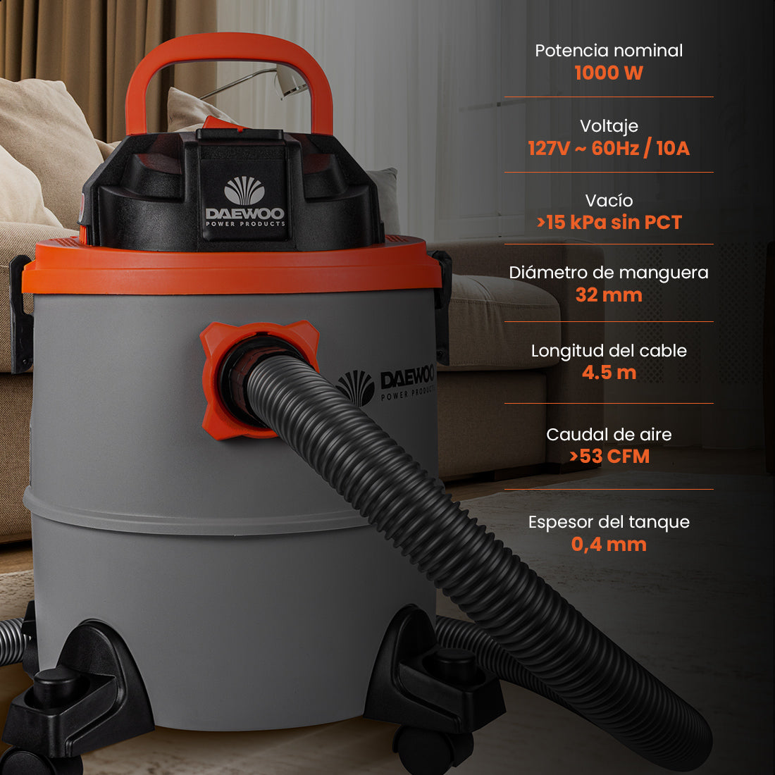 Esta aspiradora es la solución ideal para mantener tus espacios limpios y frescos. Con un potente motor de 1000W y una capacidad de 20 litros / 5.3 galones, es perfecta para aspirar tanto polvo como líquidos.